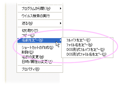 | ◆ファイル/フォルダの名前をクリップボードへコピー エクスプローラで、ファイルあるいはフォルダを選択して右クリックし、メニュ ーを表示して下さい。メニューに「名前をコピー」が追加されています。このメニ ュー項目を選択すると、サブメニューに以下の項目があります。 ・フルパス ・ファイル名 ・DOS フルパス ・DOS ファイル名 それぞれの形式で、選択したファイルあるいはフォルダの名前がクリップボード にコピーされます。 |